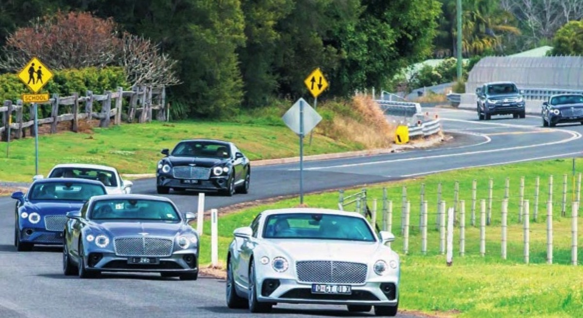 All around us are dips and peaks of lush green, tapering off into a blue horizon as the ocean meets the sky. However, rising from the descent of a slope metres away from the patio is a gleaming Continental GT on a white platform. It looks incongruous in this landscape, the only work of man in an expanse of nature as far as the eye can see. Though absurdly out of place, there is also something right about this view.